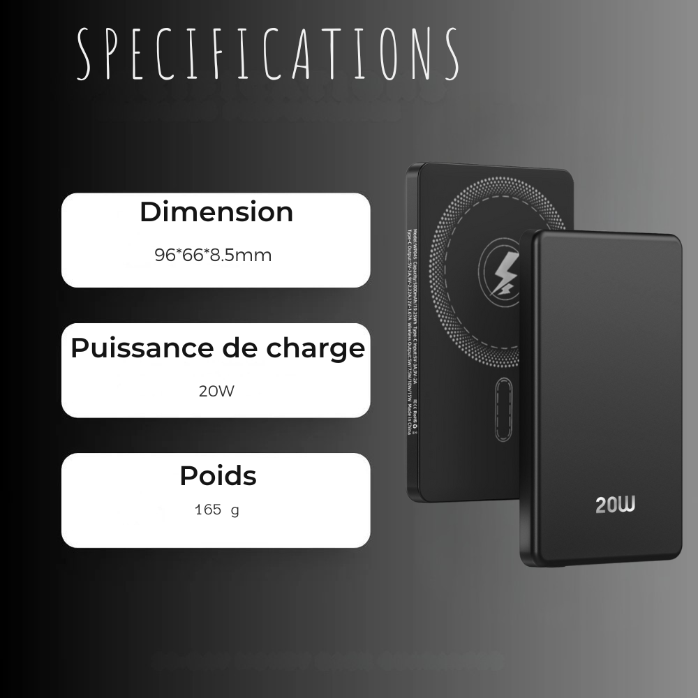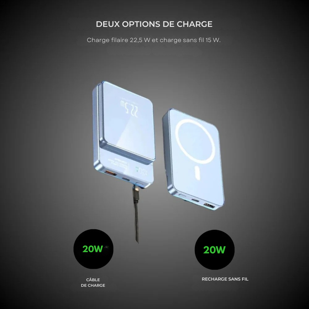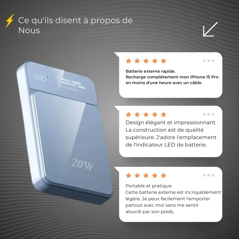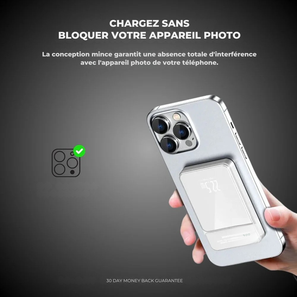 Oui — et même souvent plus vite. La batterie MagneticBoost utilise une technologie de charge rapide jusqu’à 20 W, ce qui permet d’atteindre jusqu’à 50 % de batterie en moins de 30 minutes selon le modèle de téléphone. Vous profitez d’une puissance comparable à un chargeur filaire, sans aucun câble.